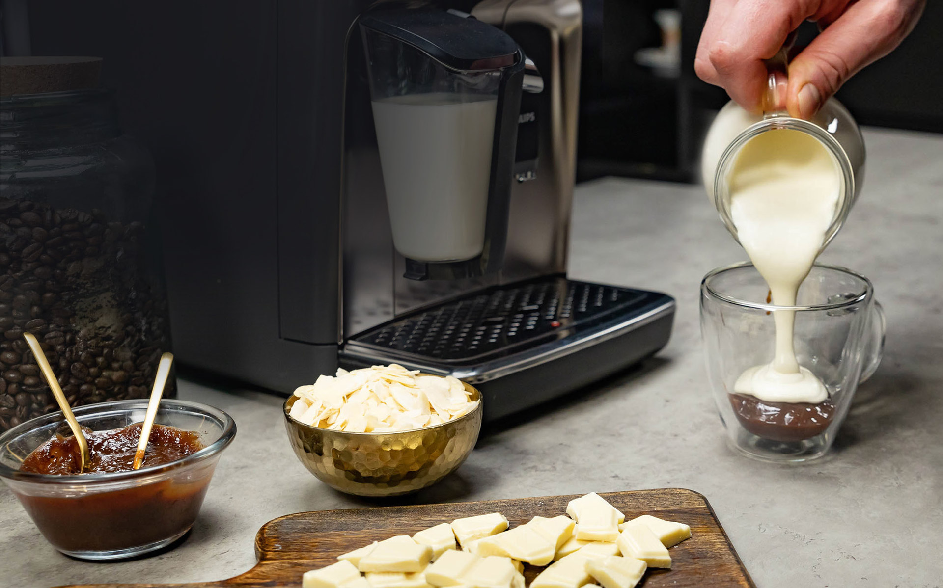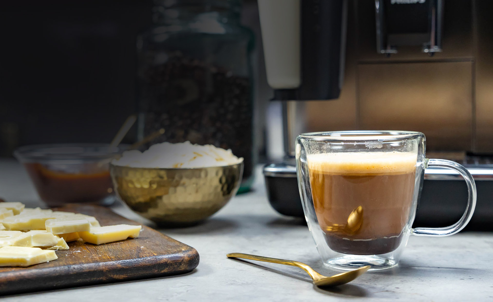 Gaminimas: 1) Baltojo šokolado putėsių receptas: šokoladą ištirpinkite vandens vonelėje kartu su 100 ml plakamos grietinėlės, kaitinkite tol, kol ištirps, tada maišykite, kol visos sudedamosios dalys susimaišys. Palikite atvėsti. Tuo metu plaktuvu suplakite likusią grietinėlę (400 ml) iki standumo. Dėkite po šauktą į atvėsusį baltąjį šokoladą ir kruopščiai išmaišykite. 2) Į puodelį ar nedidelę stiklinę dėkite slyvų uogienę (svarbu, kad ši būtų sutrinta į vientisą, lygią masę). Ant uogienės supilkite baltojo šokolado putėsius ir paruoškite espresso su daugiau ristretto.. Skanaus!