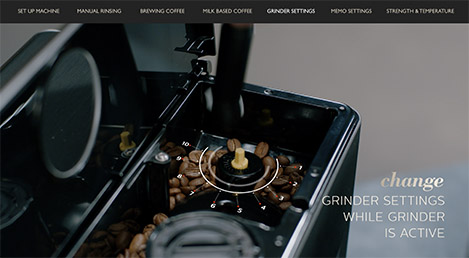 Malūnėlio nustatymai reguliuojami rankenėle, kuri yra pupelių inde. Galite rinktis smulkiai sumaltas pupeles, jei norite sodrios espreso kavos, arba rupiau sumaltas pupeles, jei norite švelnesnio skonio espreso kavos. Reguliuokite malimo nustatymus tik tada, kai aparatas mala kavos pupeles. Jei norite reguliuoti malūnėlį, padėkite puodelį po kavos snapeliu. Paspausite espreso kavos mygtuką ir, kai malūnėlis pradės malti, pakeiskite nustatymus reguliavimo rankenėle.